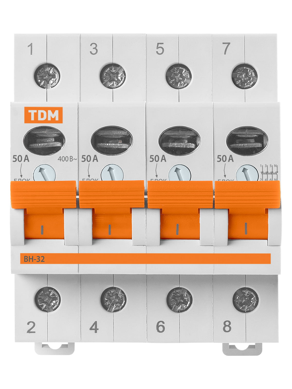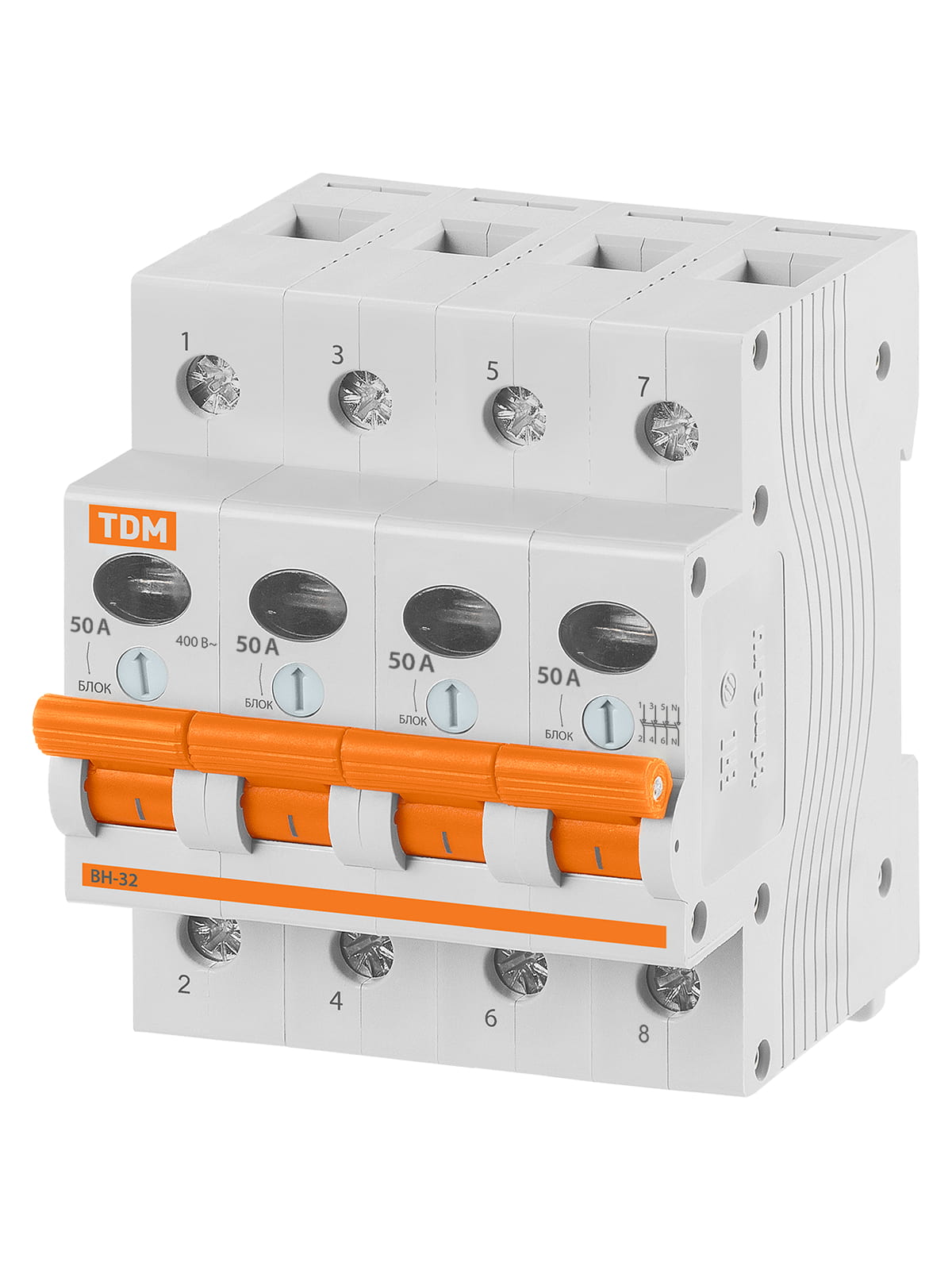 Выключатель нагрузки ВН-32 четырехполюсный с номинальным током 50А используется в качестве вводно-распределительного устройства в жилых и общественных зданиях.