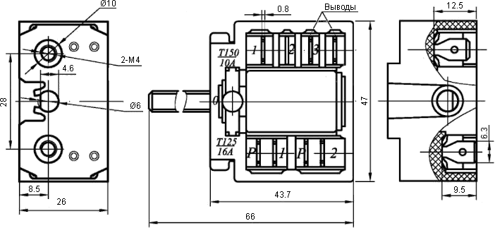 Номинальная нагрузка: при Т125 16А/250В~, при Т150 10А/250В~.